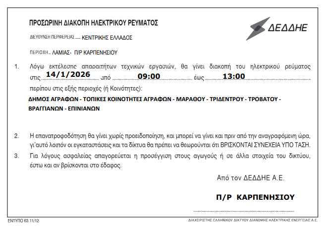 Ο ΔΕΔΔΗΕ ενημερώνει ότι, λόγω εκτέλεσης απαραίτητων τεχνικών εργασιών, θα πραγματοποιηθεί προσωρινή διακοπή ηλεκτρικού ρεύματος την Τετάρτη 14 Ιανουαρίου 2026, στις εξής περιοχές του Δήμου Αγράφων:
