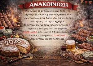 Την Πέμπτη 12 Φεβρουαρίου, στις 12:00, στο Κερασοχώρι, θα πραγματοποιηθεί η κοπή της βασιλόπιτας και ο εορτασμός της Τσικνοπέμπτης από τους υπαλλήλους του Δήμου Αγράφων.