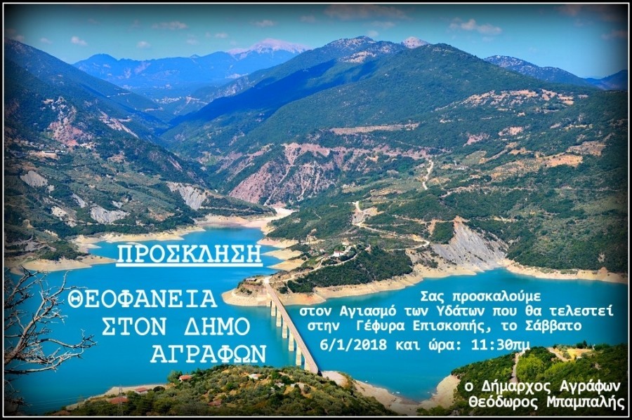 Ιαν42018O Δήμος Αγράφων σας προσκαλεί στον Αγιασμό των Υδάτων που θα πραγματοποιηθεί το Σάββατο 6 Ιανουαρίου και ώρα 11:30 πμ. κοινοποίηση σε Share on FacebookShare on Facebook Share on LinkedInShare on LinkedIn TweetShare on Twitter Pin itShare on Pinterest Post navigationΠροηγούμενοPrevious post:Πρόσκληση στην 1η συνεδρίαση Δημοτικού ΣυμβουλίουΕπόμενοNext post:Πρόσκληση στην 1η συνεδρίαση Οικονομικής Επιτροπής